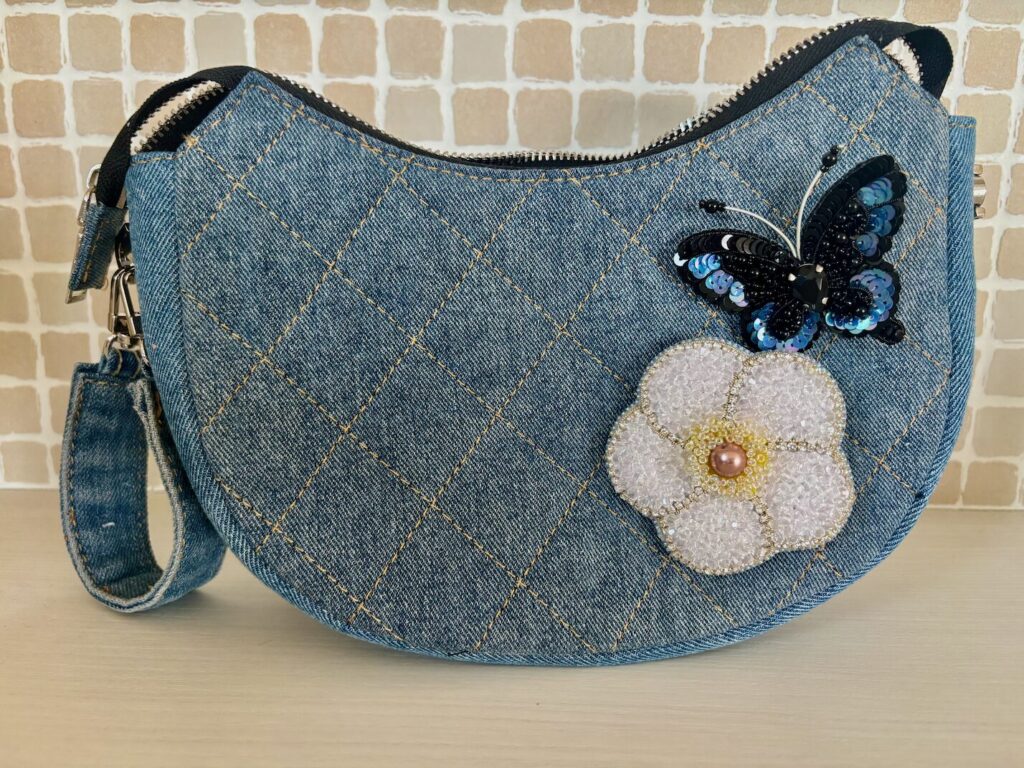同じ工場で作られたビーズのブローチを付けると更にグレードアップします。お好きなデザインの飾りをつけてオリジナルのバッグも素敵です。